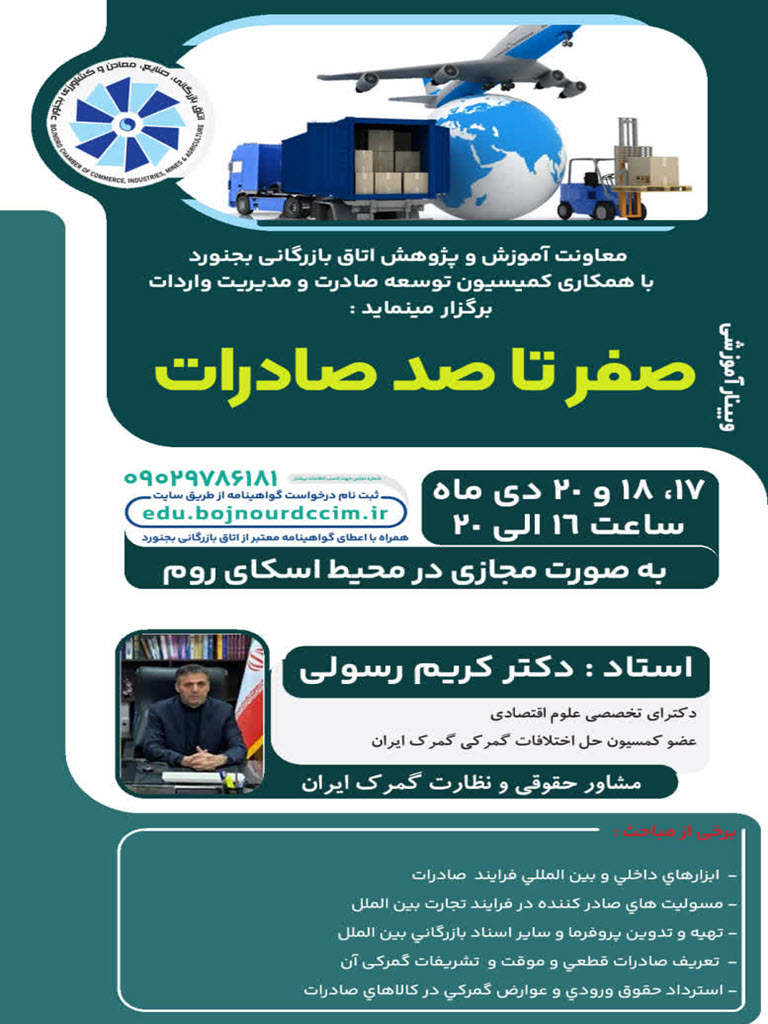 صفر تا صد صادرات معاونت آموزشی و پژوهشی اتاق بازرگانی بجنورد با همکاری کمسیون توسعه صادرات و مدیریت واردات برگزار می نماید دی ۱۰, ۱۴۰۴ 2:39 ب.ظ بدون دیدگاه
